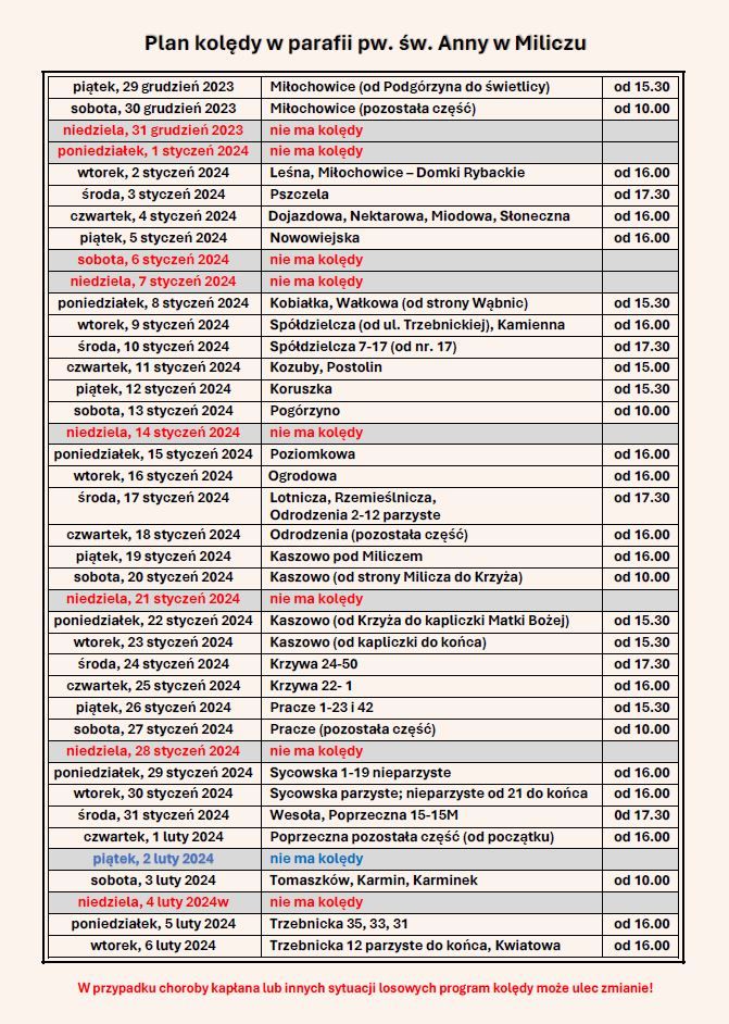 Wizyta duszpasterska - kolęda w naszej parafii rozpocznie się 29. grudnia 2023 r. Szczegółowy plan kolędy.