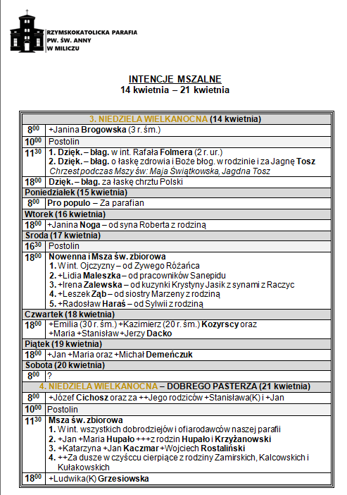 INTENCJE MSZALNE - 14 kwietnia - 21 kwietnia