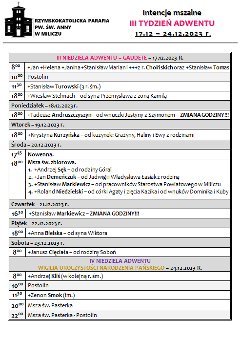 Intencje mszalne — III TYDZIEŃ ADWENTU — 17.12 - 24.12