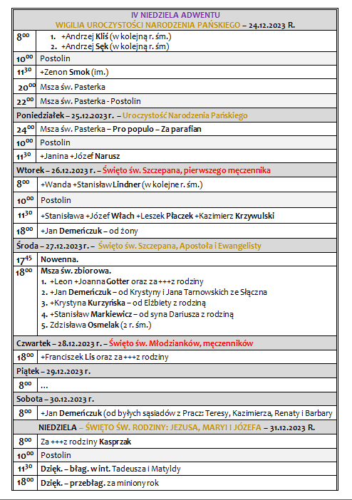 INTENCJE MSZALNE - IV NIEDZIELA ADWENTU - WILIGIA UROCZYSTOŚCI NARODZENIA PAŃSKIEGO - 24.12.2023 R.
